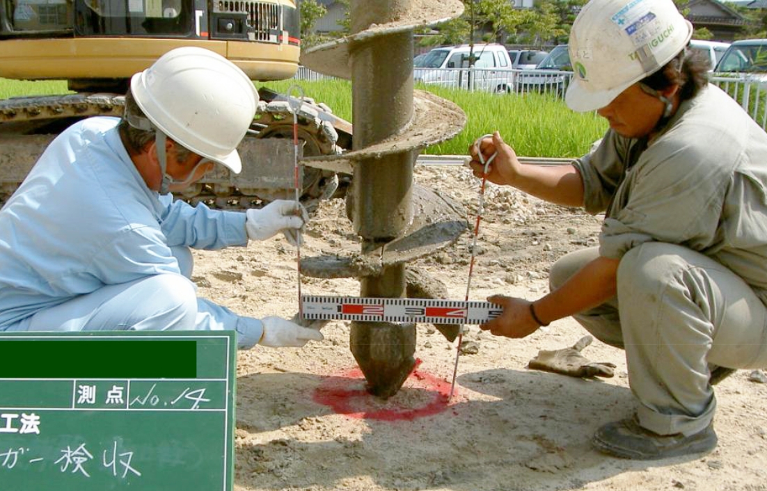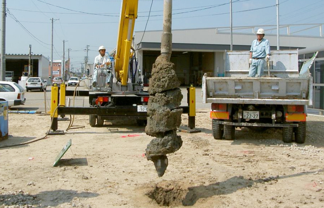らせん状の平鋼「NSスパイク」を回転させながら地盤に圧入する「NSスパイク工法」は、地盤のせん断力を向上させる地盤補強工法で、コンクリートを使用せず、しかもリサイクル可能な環境に優しい工法です。 乾式工法であるため、経済性の向上、施工時間の短縮、施工時の騒音・振動の低減など多くのメリットを持った工法です。